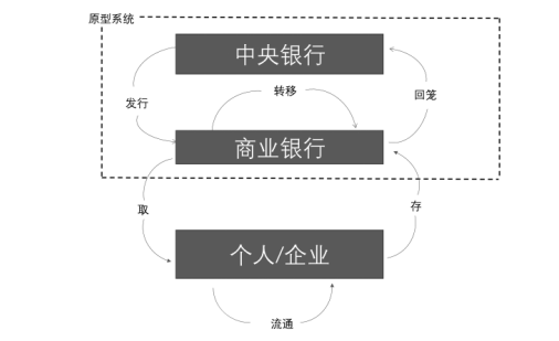 第 1 层参与主体包括中央银行和商业银行,涉及 CBDC 的发行、回笼及在商业银行之间的转移,原型系统一期完成从中央银行到商业银行的闭环,即通过发行和回笼,CBDC 在中央银行的发行库和商业银行的银行库之间转移,整个社会的 CBDC 总量发生增加或减少的变化,并在机制上保证中央银行货币发行总量不变;