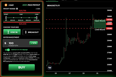 Breakout则跟Stay in完全相反,订单成交后你的初始价值将从本金价值的200%开始递减,一直到BTC价格上涨或者下跌超出了价格区间。如果价格没有超出区间,价值将持续递减 24小时后递减到100%的本金价值,2天到期后归零。同样例子,买入了100 USD的Breakout并成交后,价格越早突破订单的价格区间利润则越多,如果超过24小时后价格还没有突破价格区间,将面临亏损。